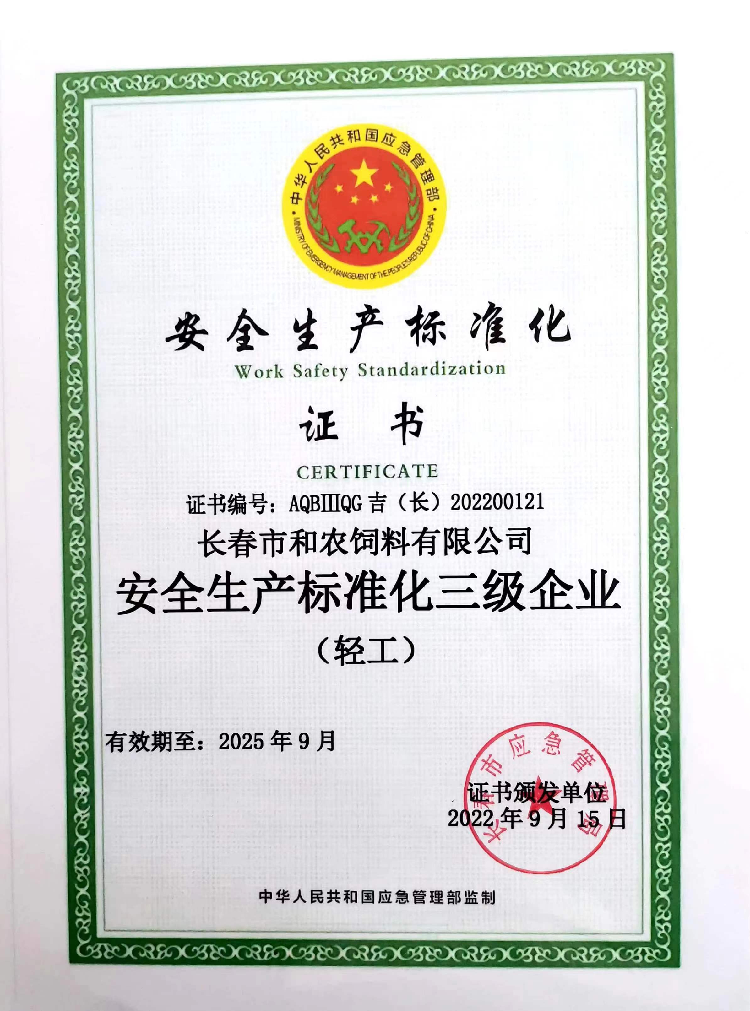 和農牧業(yè)集團下屬公司 長春市和農飼料有限公司榮獲由長春市應急管理局頒發(fā)、中華人民共和國應急管理部監(jiān)制的“安全生產標準化三級企業(yè)”證書,標志著長春和農飼料安全生產標準化建設邁上新臺階。