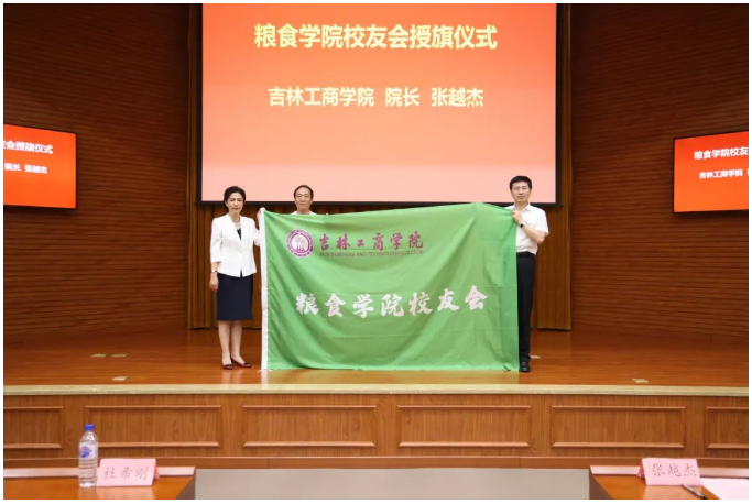 張越杰為糧食學院校友會授旗,吉林省和農(nóng)牧業(yè)集團董事長方彥明先生。