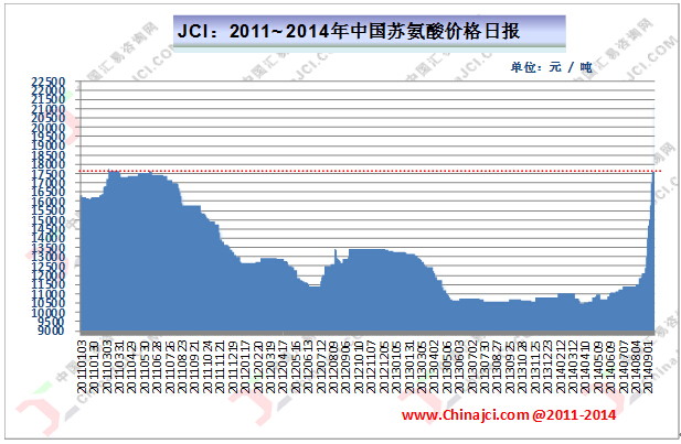 據(jù)JCI統(tǒng)計(jì)數(shù)據(jù)顯示,自8月下旬以來,我國蘇氨酸市場價(jià)格大漲9500元/噸,上漲幅度為78.51%,截至本周初市場平均價(jià)格達(dá)到21600元/噸,部分地區(qū)市場偏高報(bào)價(jià)為22000-23000元/噸,短期價(jià)格以及上漲幅度均為近幾年的最高點(diǎn),詳見下圖所示。